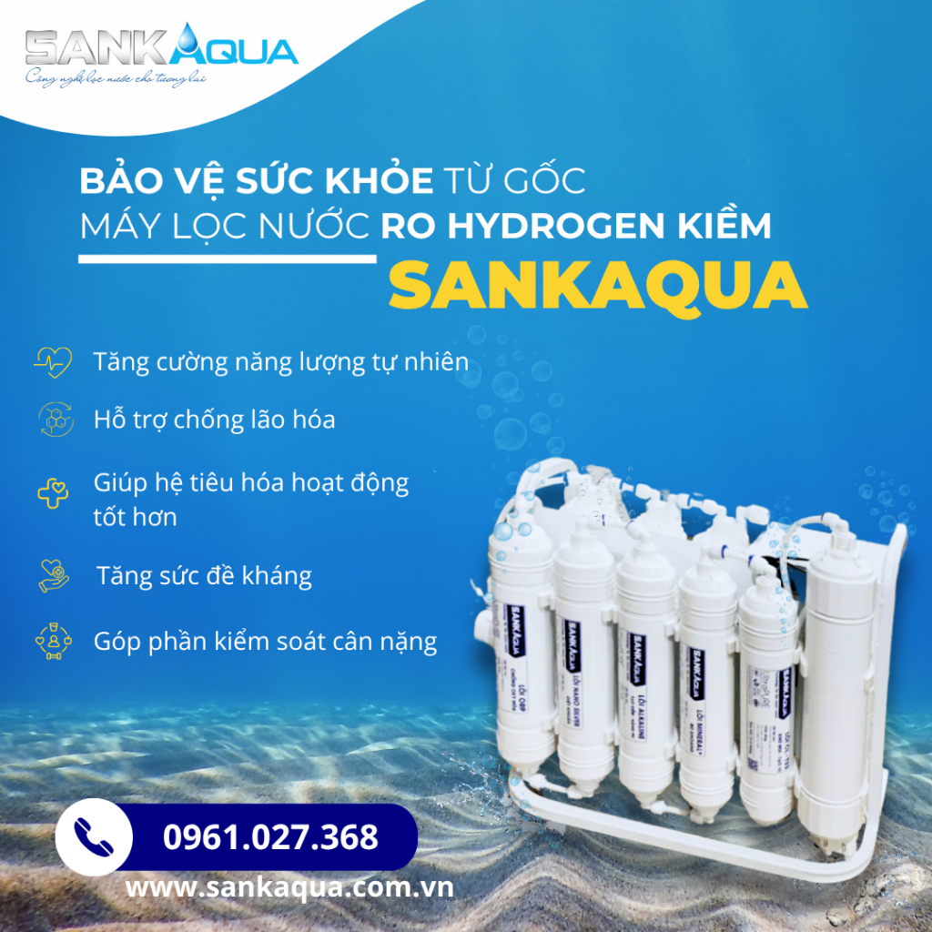 - Nước iON kiềm giàu Hydrogen Sankaqua: Bảo vệ từ gốc tế bào, chống lão hóa, tăng sức đề kháng, phòng ngừa bệnh mãn tính.